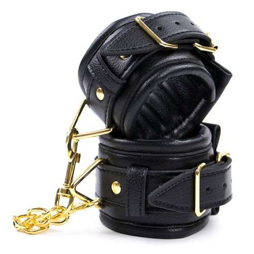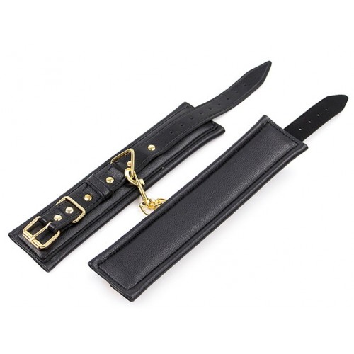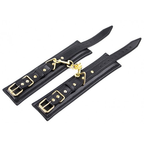 Черные кожаные наручники с золотистой цепочкой