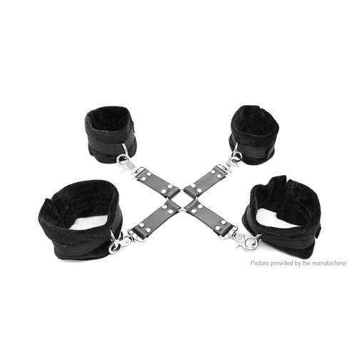 Универсальный фиксатор, состоящий из поножей и наручников, соединенных между собой крестообразной фиксацией, позволят обездвижить Вашего партнера в любой позе.