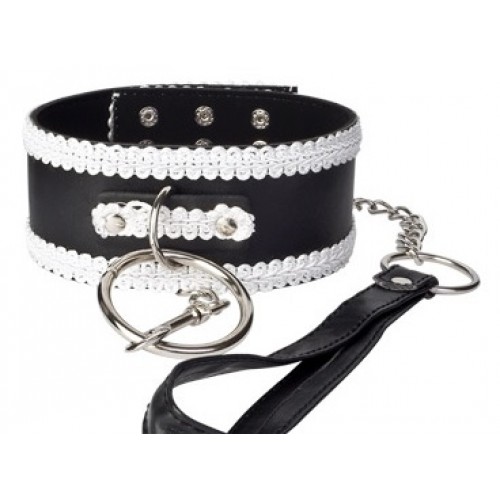 БДСМ ошейник с кольцом декорированный белым кружевом регулируется по объему при помощи металлических кнопок, расположенного сзади, так же имеется поводок цепочка с петелькой для большего удобства.
