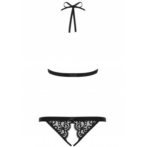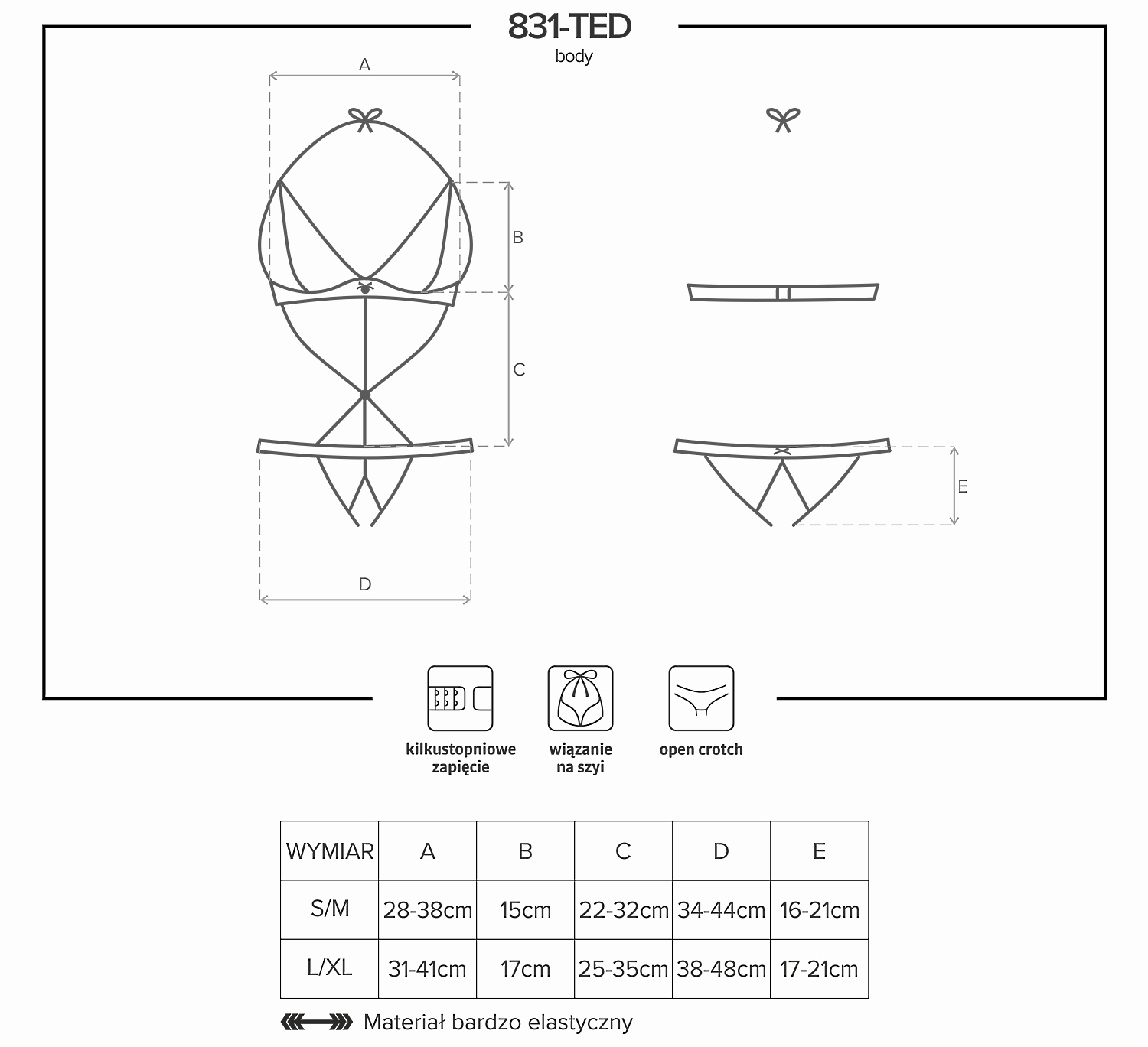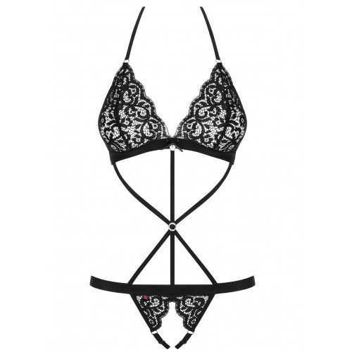 Детали: пикантное боди из черного кружева и эластичных лент, сочетание бюстгальтера и трусиков, сексуальная шнуровка на шее (открытая спина!), многоступенчатая застежка - идеальная посадка, открытая промежность, украшения в виде блестящих круглых элементов и бантов, эластичная ткань, адаптирующаяся к телу.