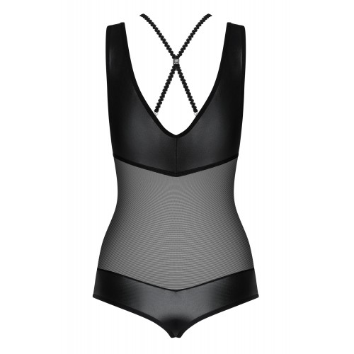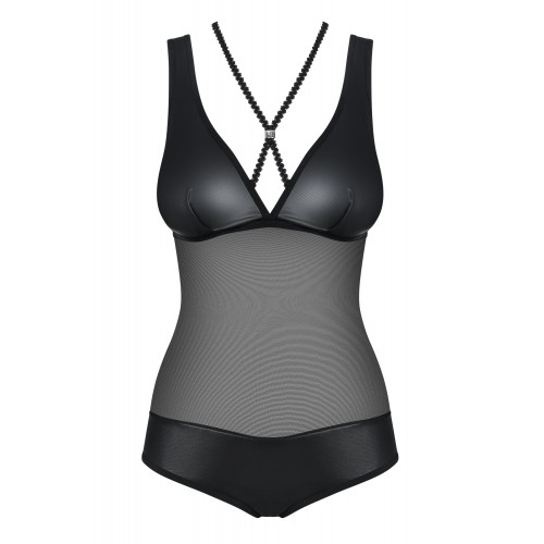 Детали: боди с добавлением блестящего материала - сексуальный «Wet Look», интригующие полоски, пересекающие декольте и спинку, серебряные украшения на стыке полос, специальная строчка на груди - визуально делает форму груди соблазнительнее, прозрачная черная сеточка - эротично подчеркнет животик и спинку, красивая, нежная, идеально эластичная ткань Multistretch.