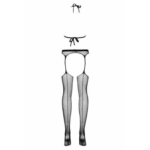 Откровенный комбинезон выполнен в виде полупрозрачного сетчатого лифа, соединенного тонкими бретельками с поясом и сексуальными чулками.