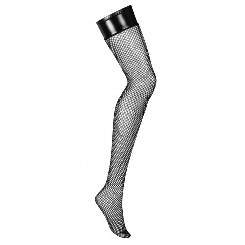 Чулки выполнены из черной сетки плотного плетения. На бедрах вставки из гладкого блестящего материала.