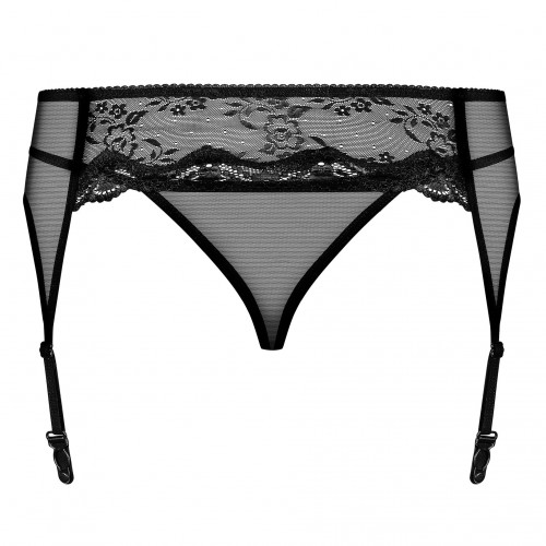 Детали: непревзойденный классический черный цвет, цветочное кружево спереди и сзади по линии талии, пояс украшен цирконом - без никеля, миниатюрные трусики-стринги из прозрачной ткани, приятная к телу ткань.