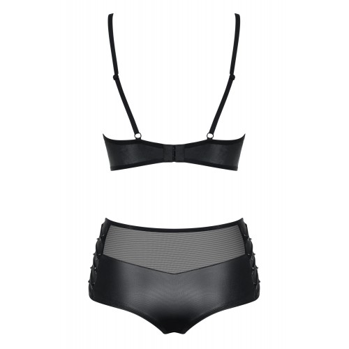 В комплект входят бюстгальтер и трусики-шортики с завышенной талией.