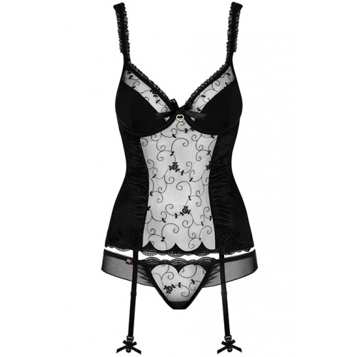 Притягательный корсаж продуман до мелочей - плотные вставки по бокам стройнят фигуру, прозрачные кружевные пикантно обнажают тело, затемненные чашки скрывают сосочки, оставляя интригу. Цветочный мотив кружева добавит образу шарма.