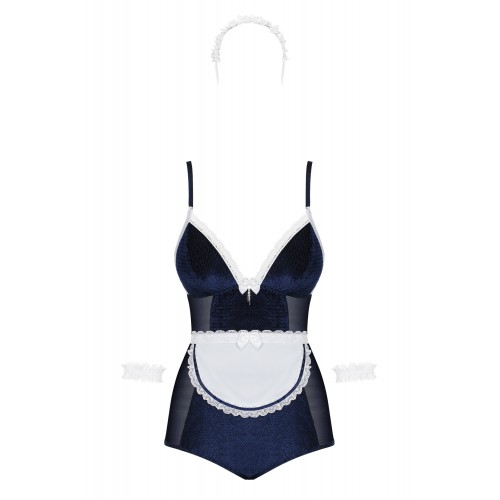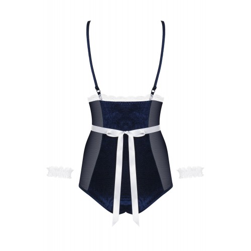Детали: костюм 2 в 1 - элегантное боди превращается в очаровательный наряд горничной, боди выполнено из бархатистого матового материала темно-синего цвета - носить одно удовольствие, соблазнительная прозрачная сеточка по бокам, регулируемые бретели обеспечивают идеальную посадку, мягкие чашки подчеркивают грудь, белое кружево украшает края - пленительный образ, уникальный фартук с завязкой на спине, тонкий бант и красивый блестящий кулон, кружевная повязка на голову и кружевные украшения на запястьях - придадут костюму неповторимый характер, деликатные и эластичные ткани.