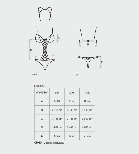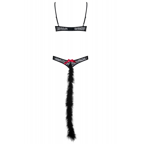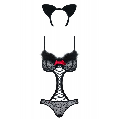 Детали: игривое боди с мотивом из леопардовых пятен, чашки с косточками и регулируемые лямки приподнимают бюст, трусики со съемным хвостом, яркие акценты - красные бантики, шнуровка