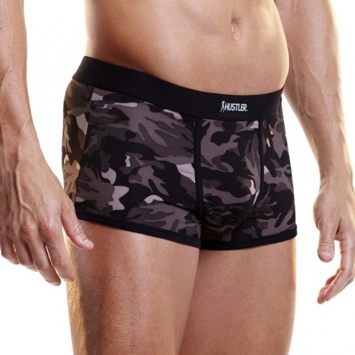 Камуфляжные обтягивающие боксеры серых оттенков из мягкой и удобной микрофибры на узкой черной резинке с фирменной нашивкой HUSTLER. Трусы с классической посадкой поэтому отлично подходят для повседневной носки.