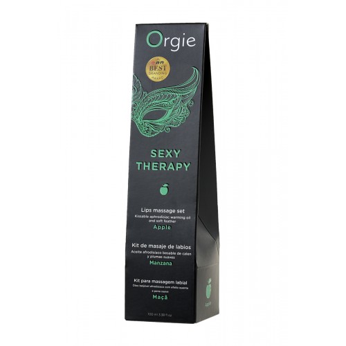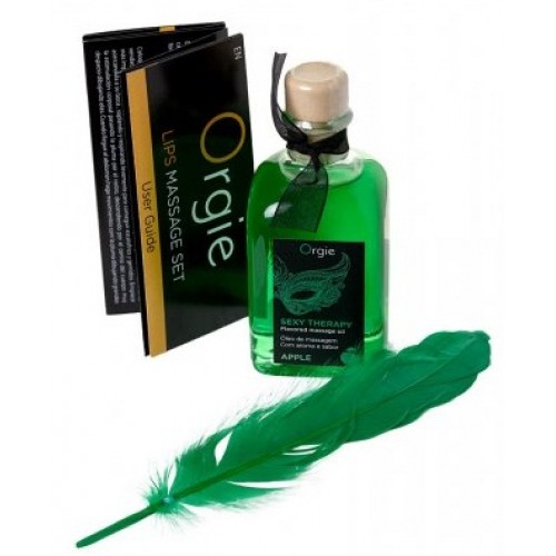 Комплект для сладких игр Orgie Lips Massage со вкусом яблока (сладкое массажное масло и перо), 100 мл