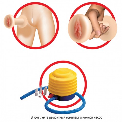 В комплекте насос для надувания и стравливания воздуха, ремкомплект и любрикант (флакон невелик, а использование таких вагины и ануса практически невозможно без любриканта, т.ч.запасайтесь).