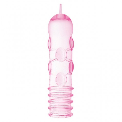 Розовая прозрачная насадка с рельефным дизайном по всей поверхности насадки с объемными ребрами и шариками.