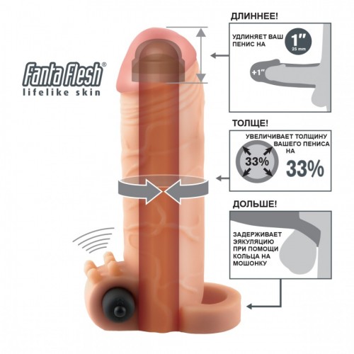 Потрясающая насадка Vibrating Real Feel 1in Extension телесного цвета сделает Вас искусным любовником, ведь с ней Вы сможете удлинить свой пенис на 3 см, расширить его больше чем на 1 см и удовлетворить партнершу на все 100%! Для женщин, которые получают удовольствие от клиторальных ласк, предусмотрена клиторальная стимуляция. Она усиливает ощущения и приближает наступление оргазма.