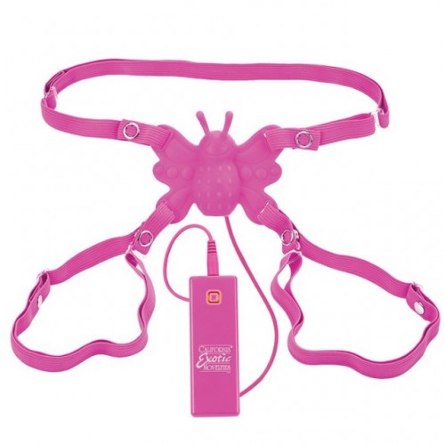 Розовая силиконовая бабочка-стимулятор на ремешках, крепящихся к телу как трусики, для стимуляции клитора.