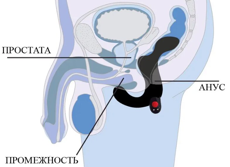 Игрушка, специально адаптированная для мужской физиологии – нижняя часть изогнута для стимуляции промежности, основной ствол вводится в задний проход.