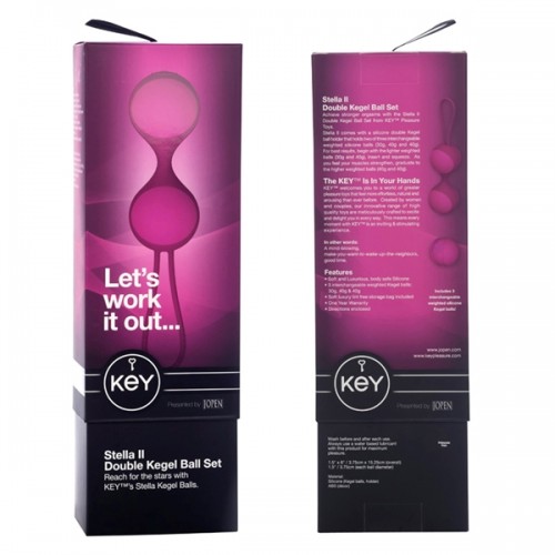 Вагинальные шарики премиум-класса Key Stella II выполнены из высококачественного медицинского силикона. Не имеют острых краев, бархатистые, необычайно приятные на ощупь, В комплекте 3 заменяемых шарика со смещенным центром тяжести - 30, 40 и 40 граммов, которые можно комбинировать, начиная с меньшего веса. Сцепка имеет ячейки только для двух шариков, т.е. максимальный вес - 80 грамм. Для опытных пользователей есть возможность использования данных шариков без сцепки. Приятным дополнением к данной игрушке является великолепно выполненная упаковка, которая состоит из двух элементов: внутренняя коробка черного цвета, имеющая мягкую внутреннюю отделку для хранения шариков, верхний бумажный чехол яркого цвета с фотографией игрушки. Еще в комплекте идет атласный мешочек для хранения шариков. Силикон не вызывает аллергии, долговечен, быстро принимает температуру тела.