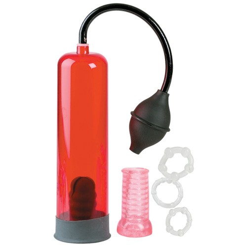 В набор игрушек для мужчин входят вакуумная помпа из пластика с грушей для нагнетания воздуха,три прозрачных эрекционных кольца и мини-мастурбатор розового цвета.