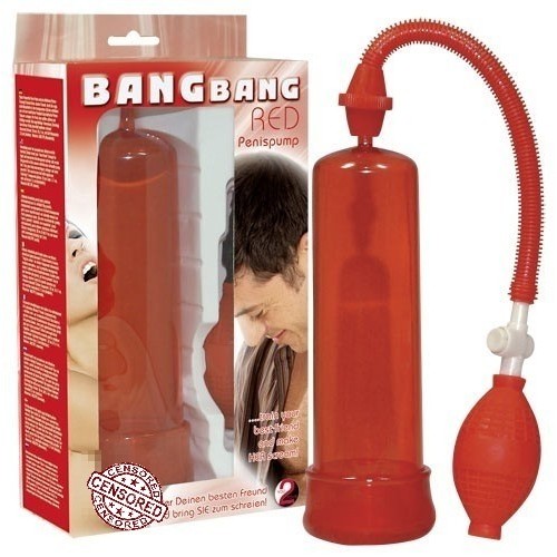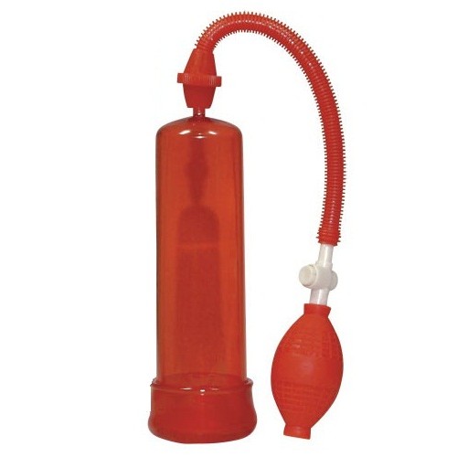 Полупрозрачный красный вакуумный цилиндр (20 см длиной, диаметром 5,7 см) со сменной мягкой манжетой (диаметр 2.5 см, хорошо растягивается), с ручным насосом и регулятором давления.