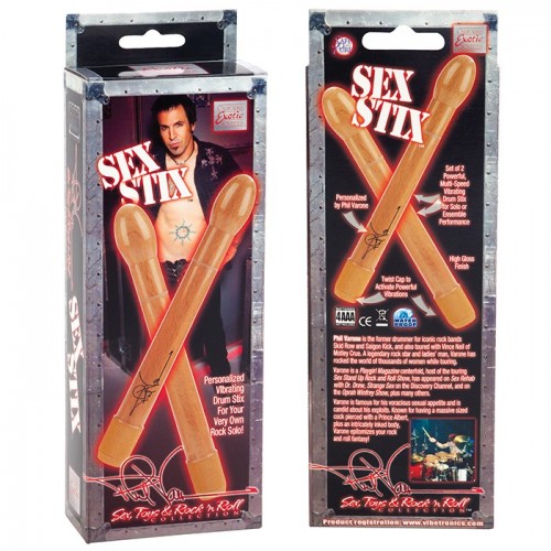 Набор из двух вибростимуляторов, выполненных в виде барабанных палочек. Вибраторы покрыты качественным гладким пластиком цвета под дерево. Имеют свойственные барабанным палочкам утолщение на концах. На одной из “палочек” поставлен автограф рок-звезды Фила Вэрона. Многоскоростная вибрация управляется встроенным пультом на рукояти.