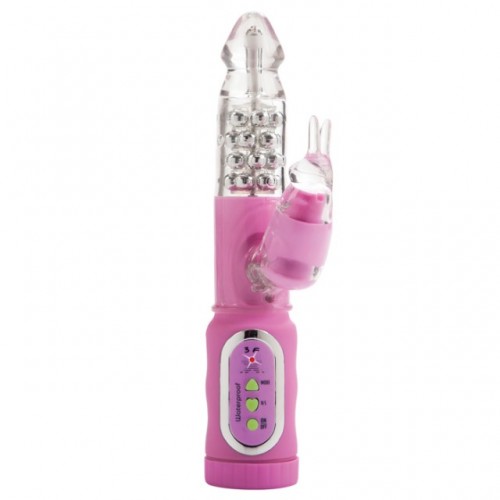 Вибромассажер нежно-розового цвета с ротационно-вращающимися 4-мя рядами шариков и и клиторальным стимулятором в виде зайчика с ушками.